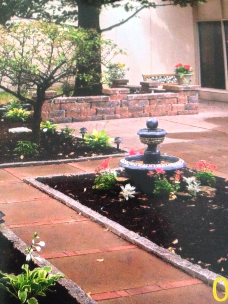 This english garden look, with water feature was a great way to enhance a hotels courtyard. Edgers were incorporated to accentuate the walk. Sitting walls and benches were added to give their guests plenty of options for enjoying this space. Completed in 2004